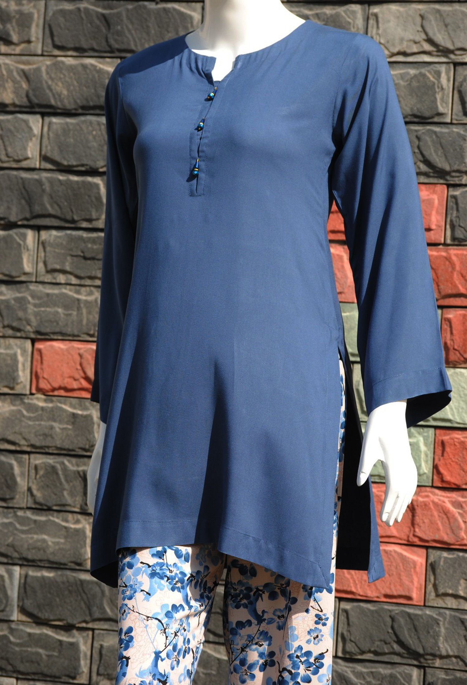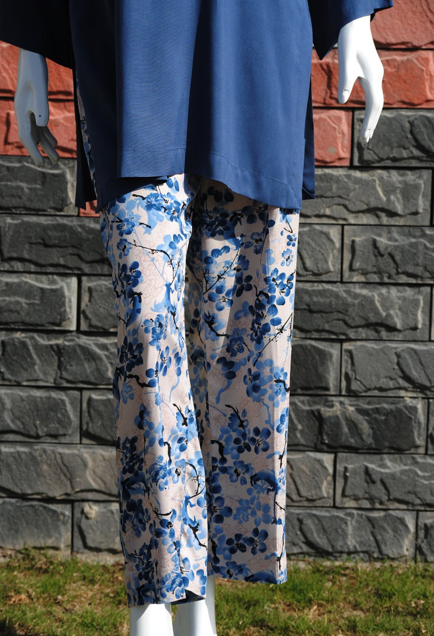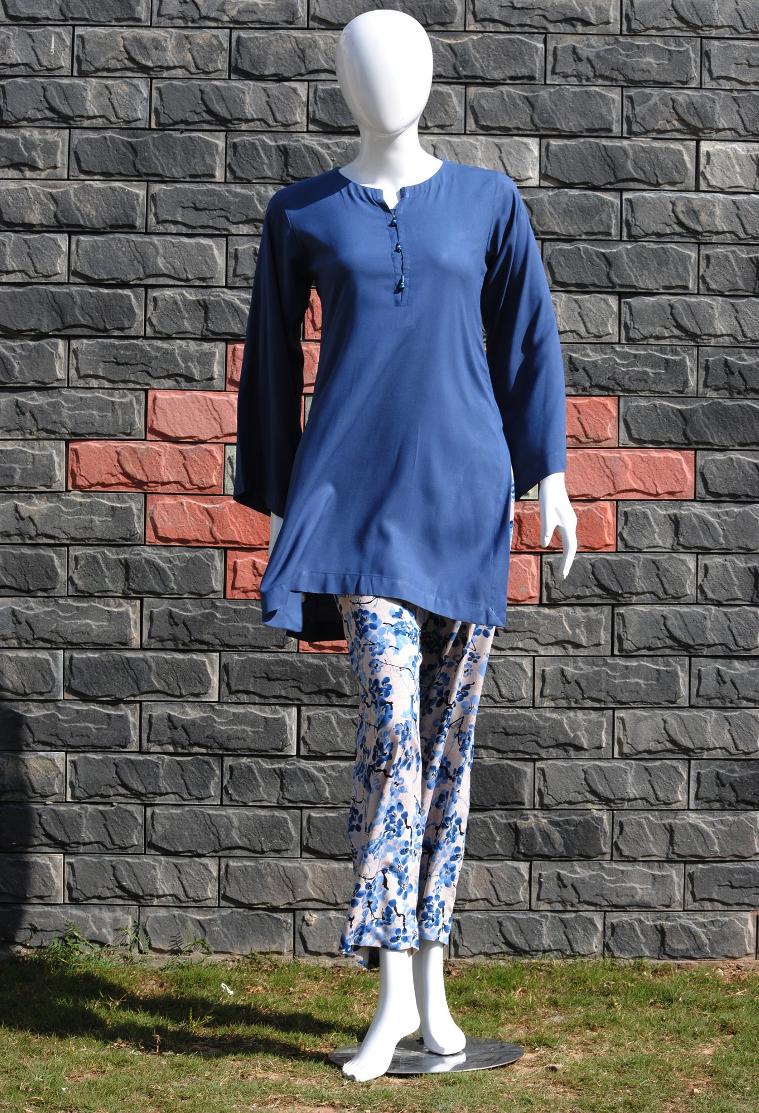 Measure around your natural waistline, keeping the tape a bit loose.| Effortlessly stylish, this blue linen dress pairs a classic plain shirt with beautifully printed trousers, offering a perfect blend of comfort and elegance for modern women. |