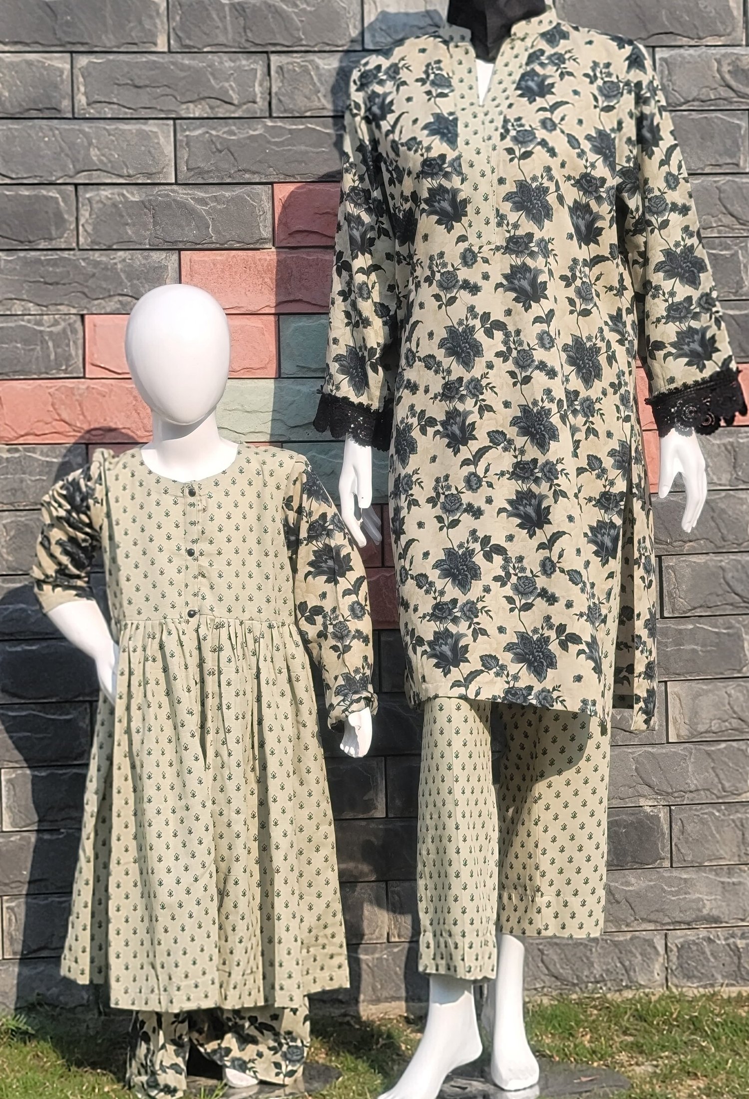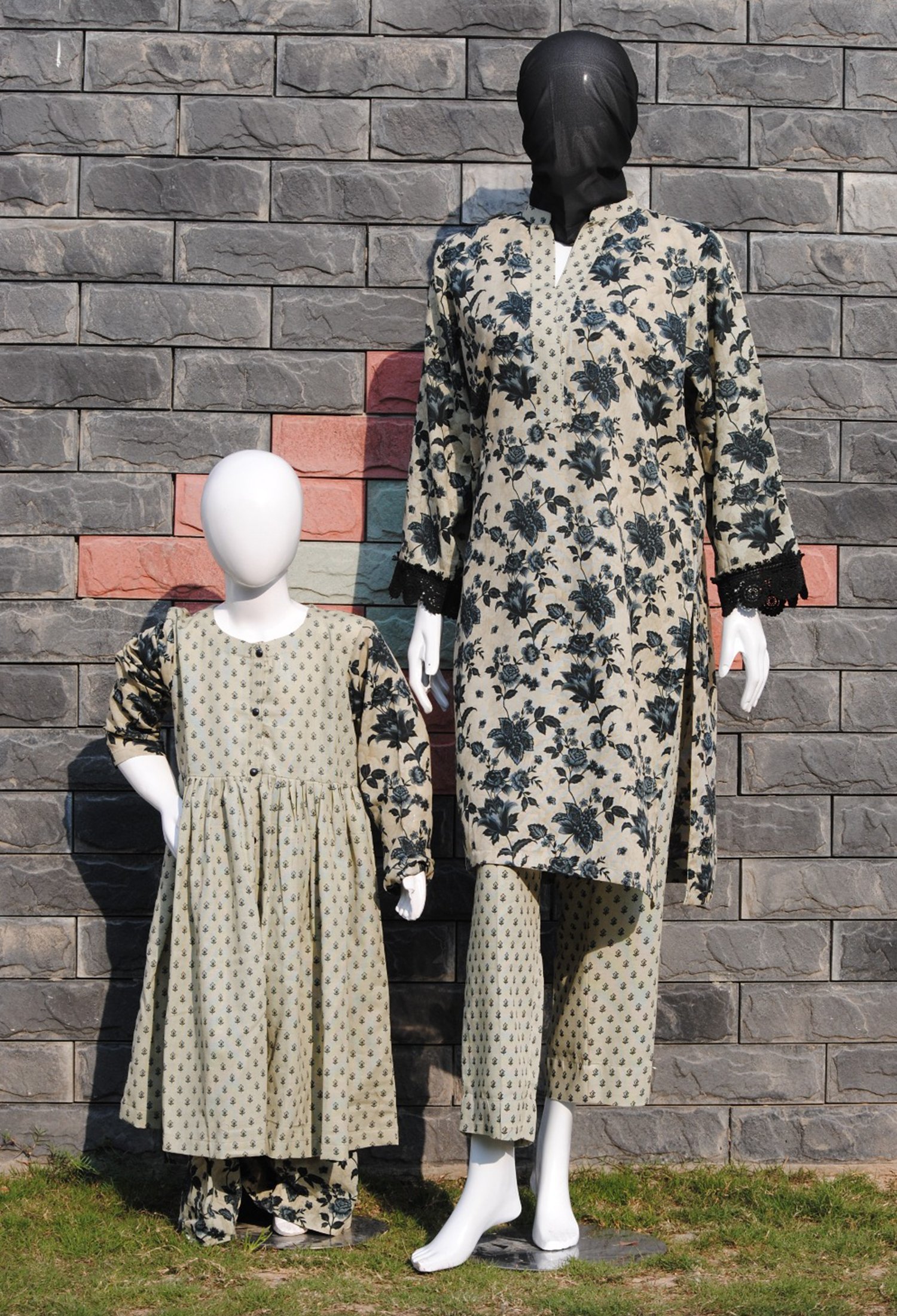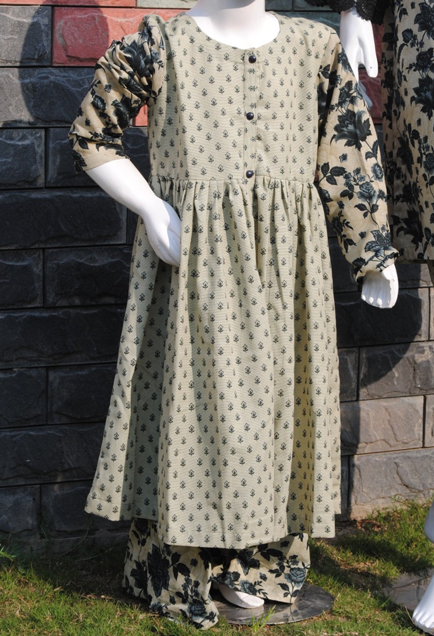 Measure around your natural waistline, keeping the tape a bit loose.| Dress your little one in this adorable 2-piece Khaddar frock set, featuring a light-toned frock with navy blue leaves and matching printed trousers. A perfect mix of playful style and comfort! |