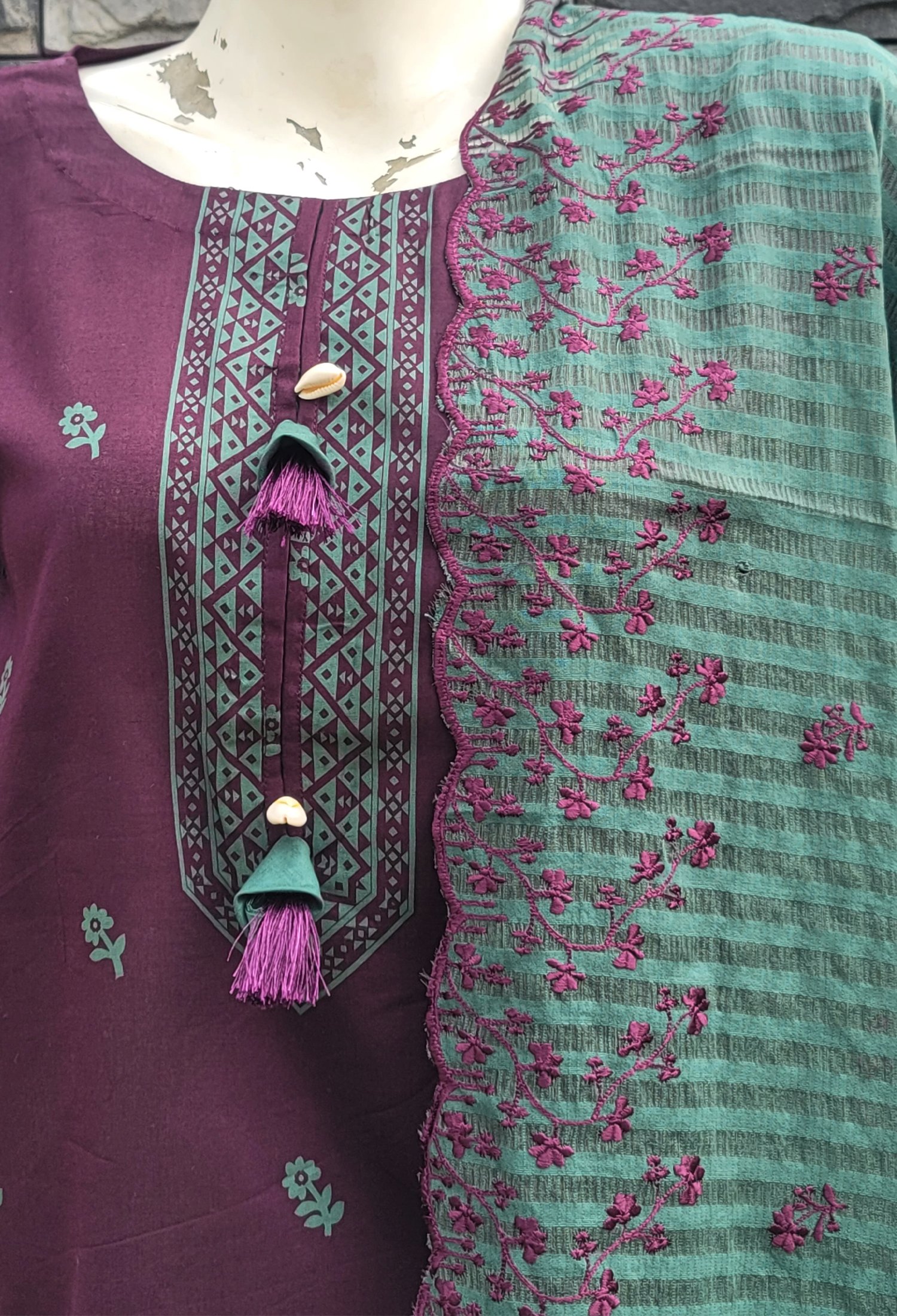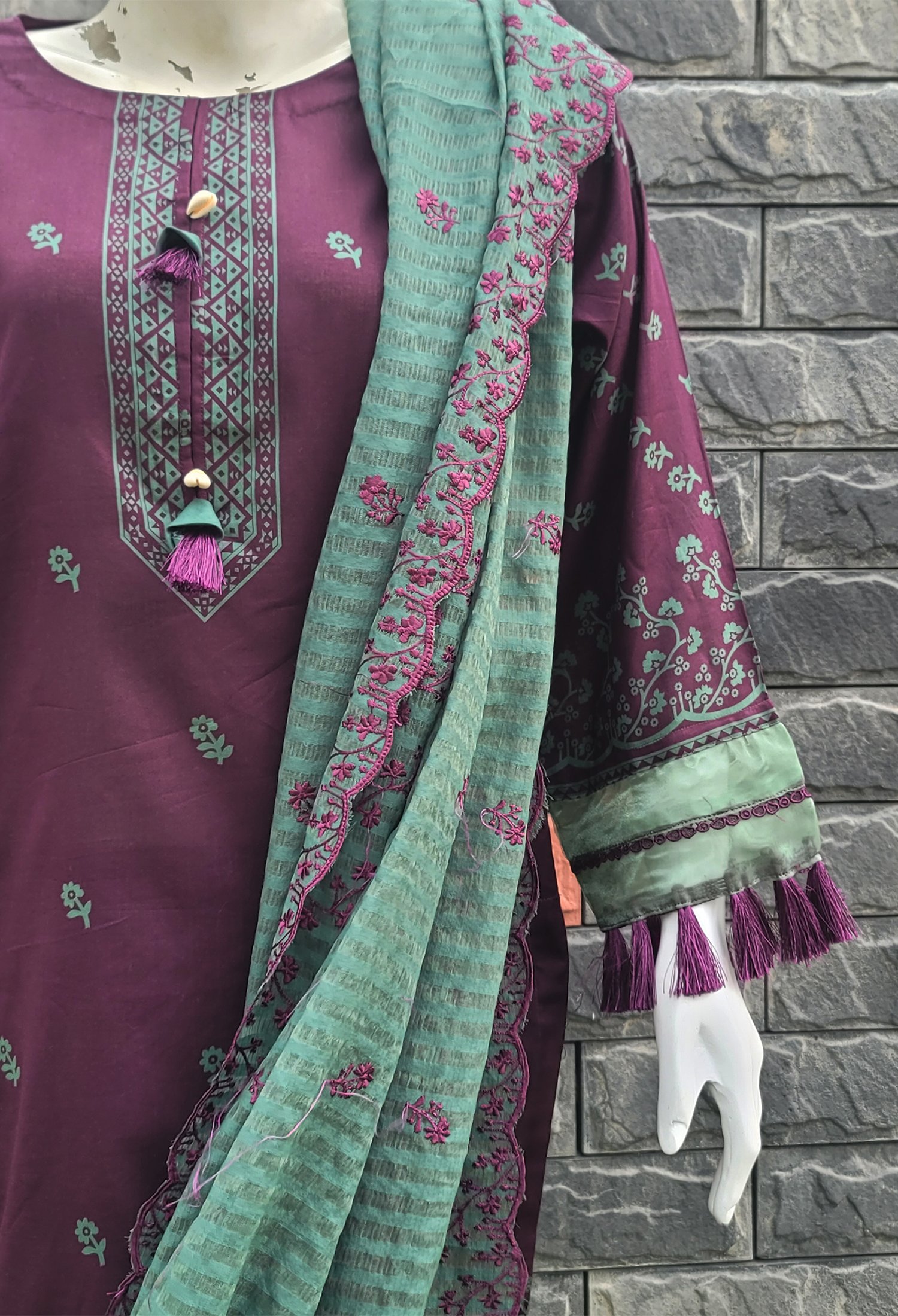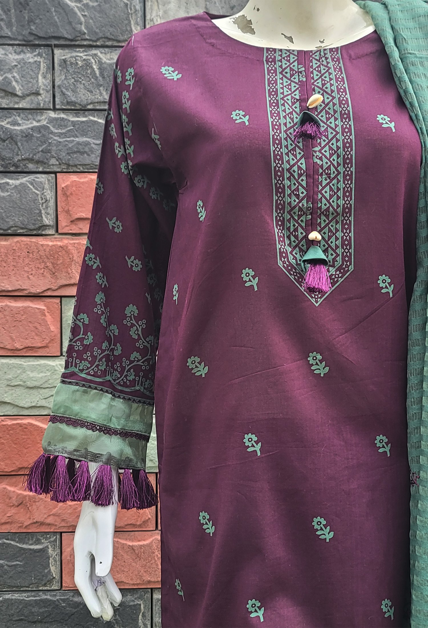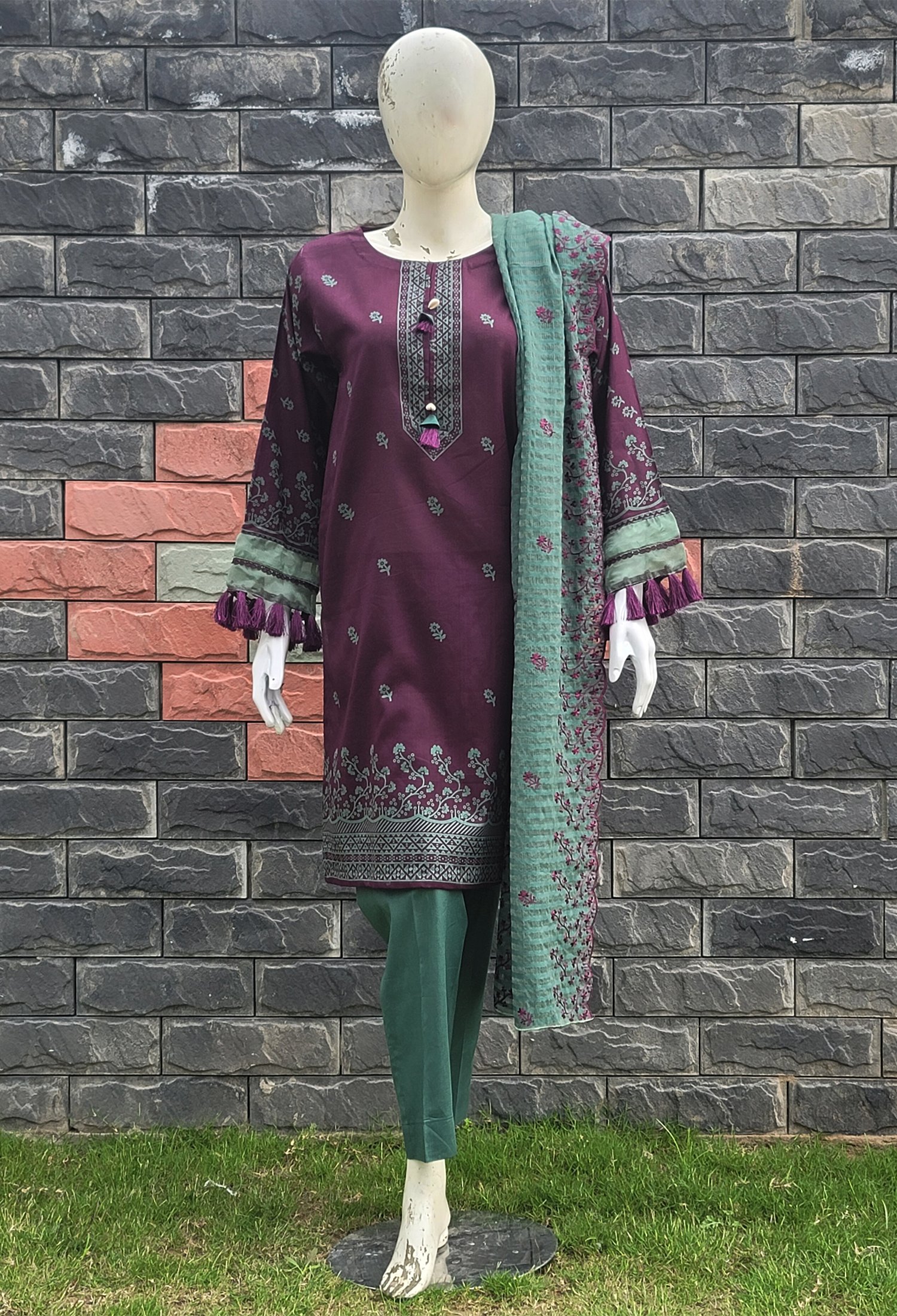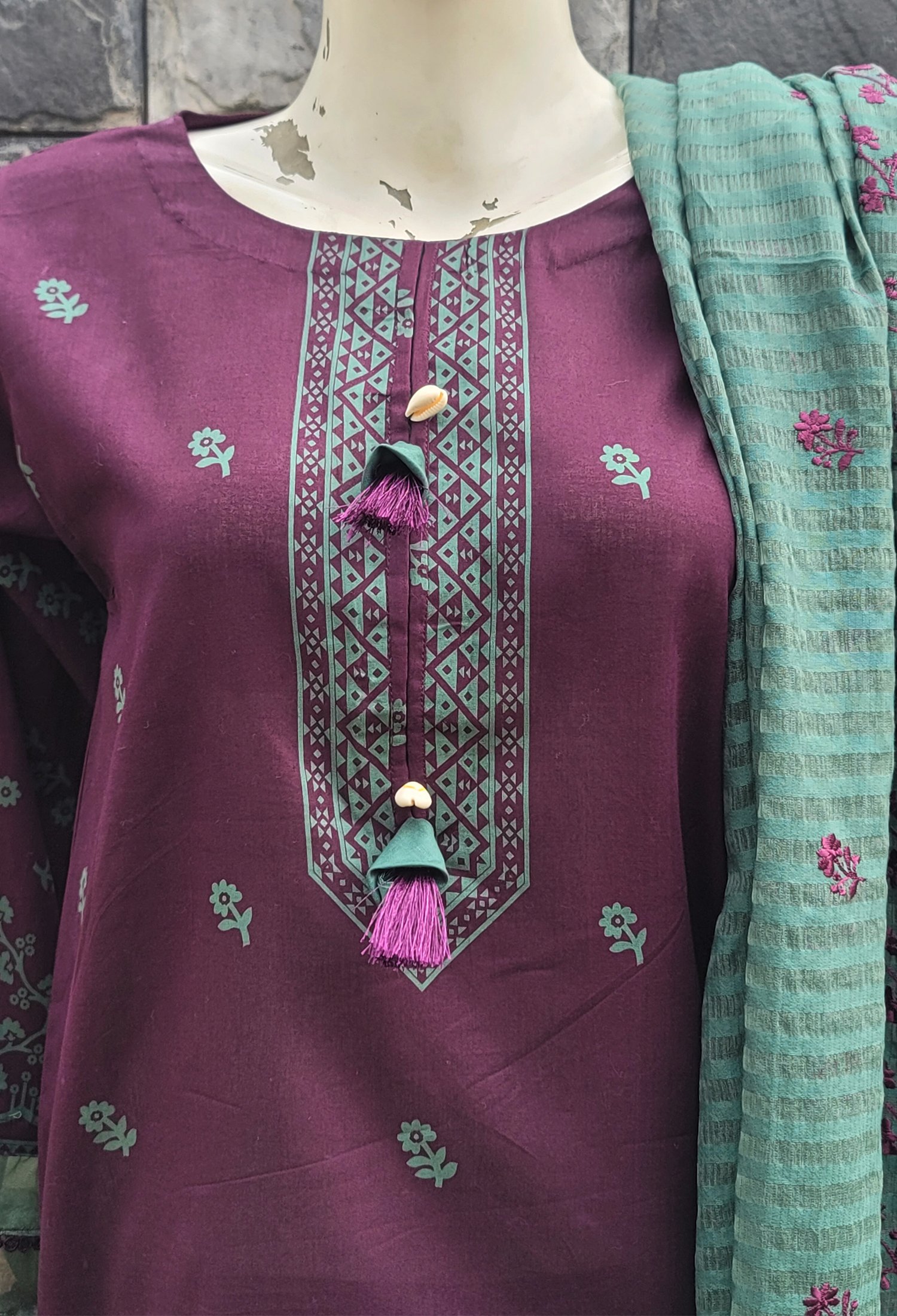 Measure around your natural waistline, keeping the tape a bit loose.Make a statement in our printed magenta shirt paired with solid green trouser and embroidered dupatta.