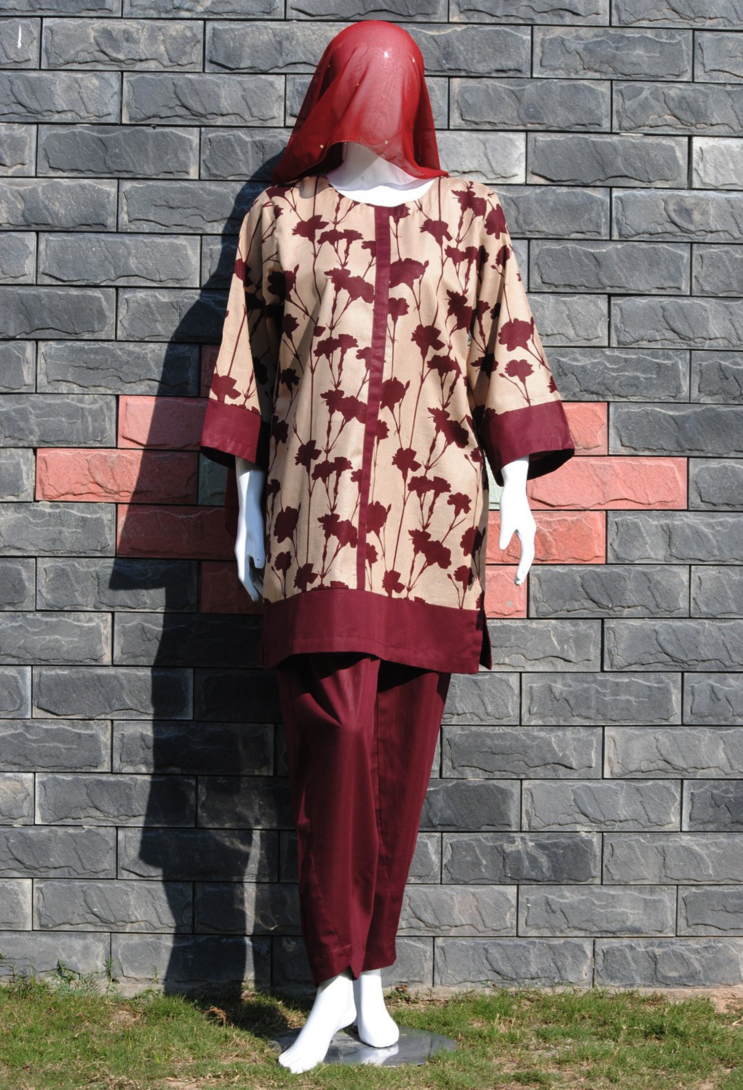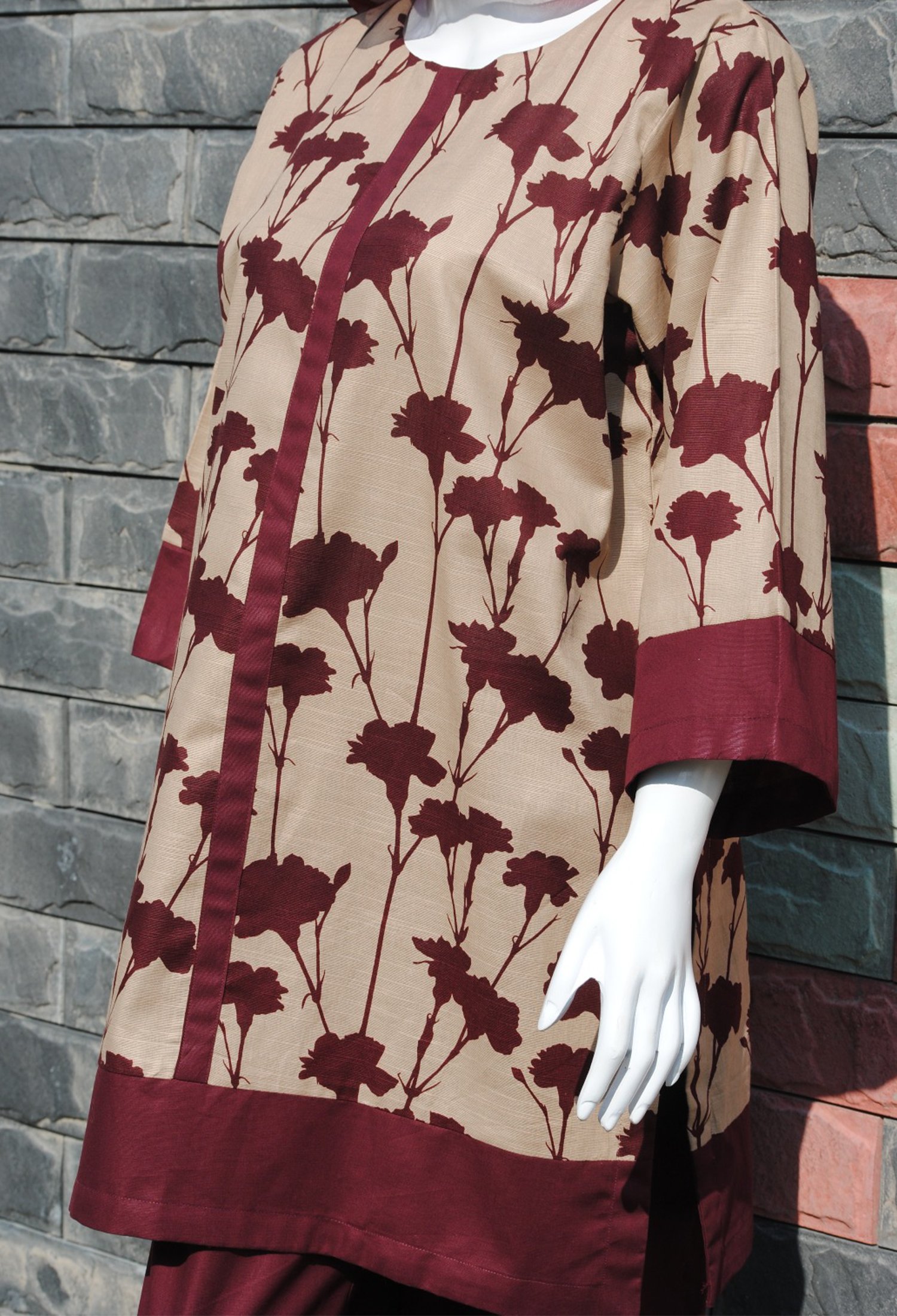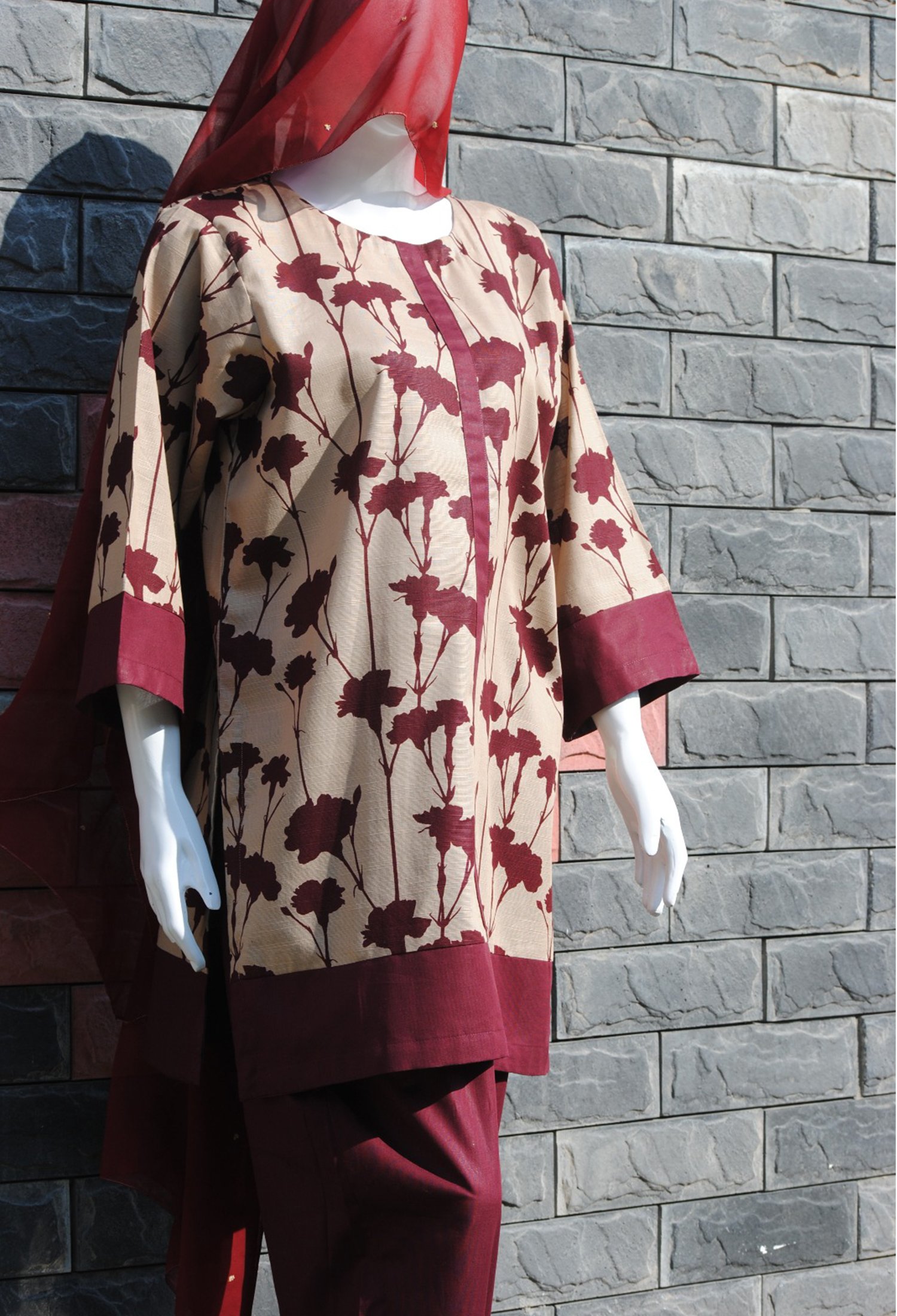 Measure around your natural waistline, keeping the tape a bit loose.| Add a touch of style to your winter wardrobe with our Maroon flowers Print with cream base, paired with solid maroon trousers. Cozy, cultural, and affordable! |