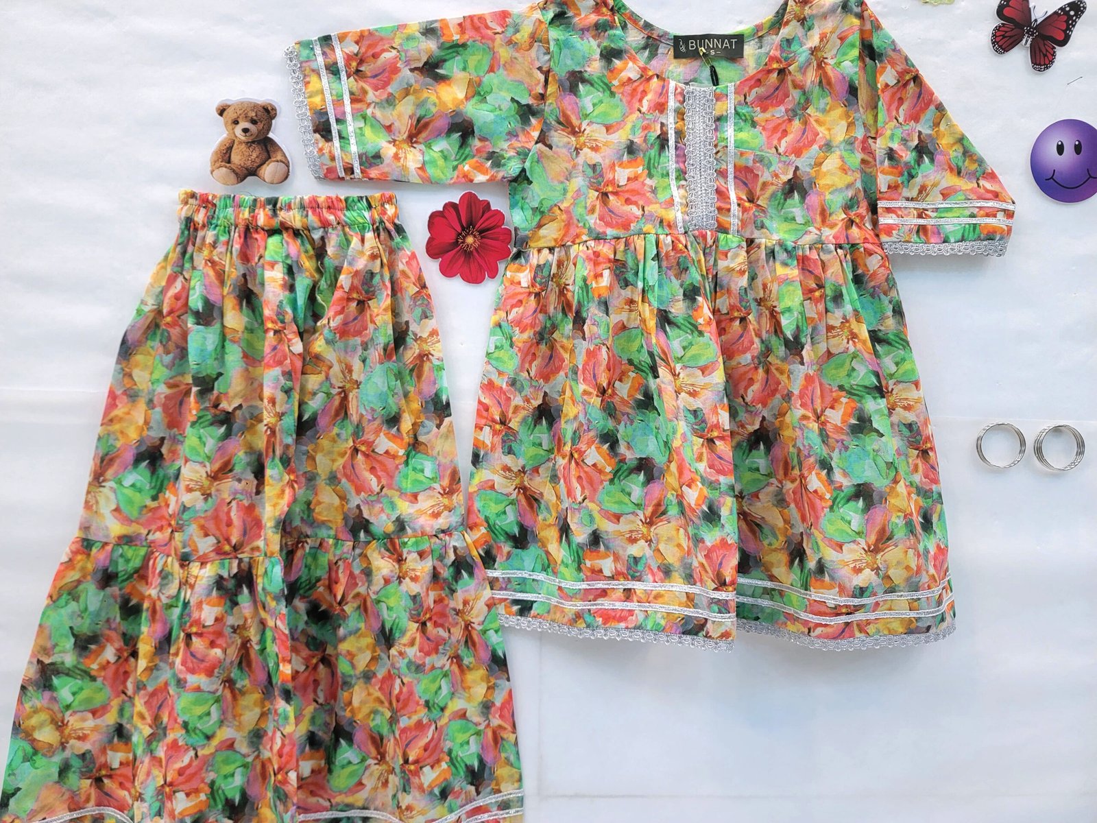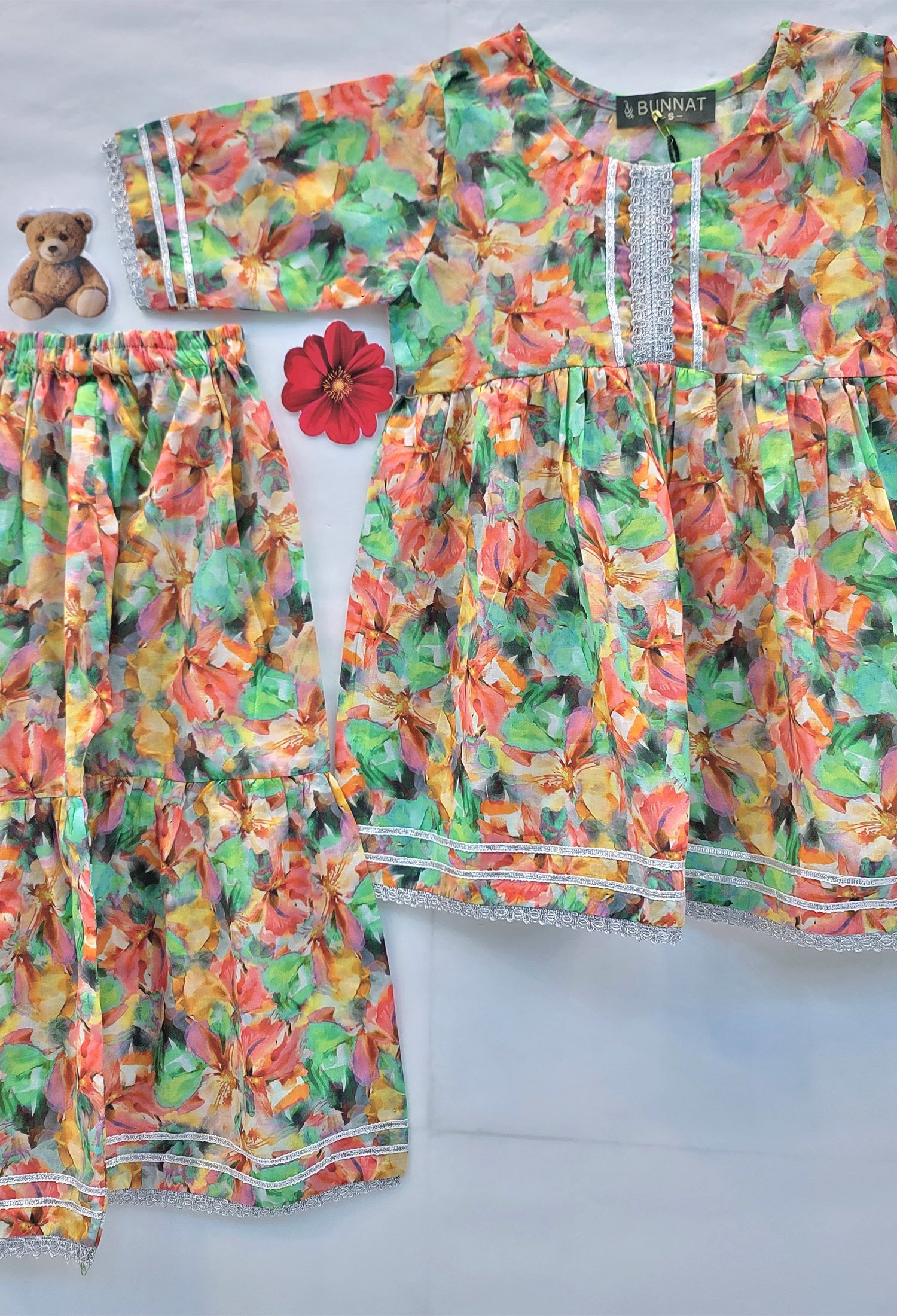 Dress your little one in our 2 piece beautiful floral printed frock with traditional gharara. Round neckline with silver lace and dori. 3 Quarter Sleeve with silver lace and dori.