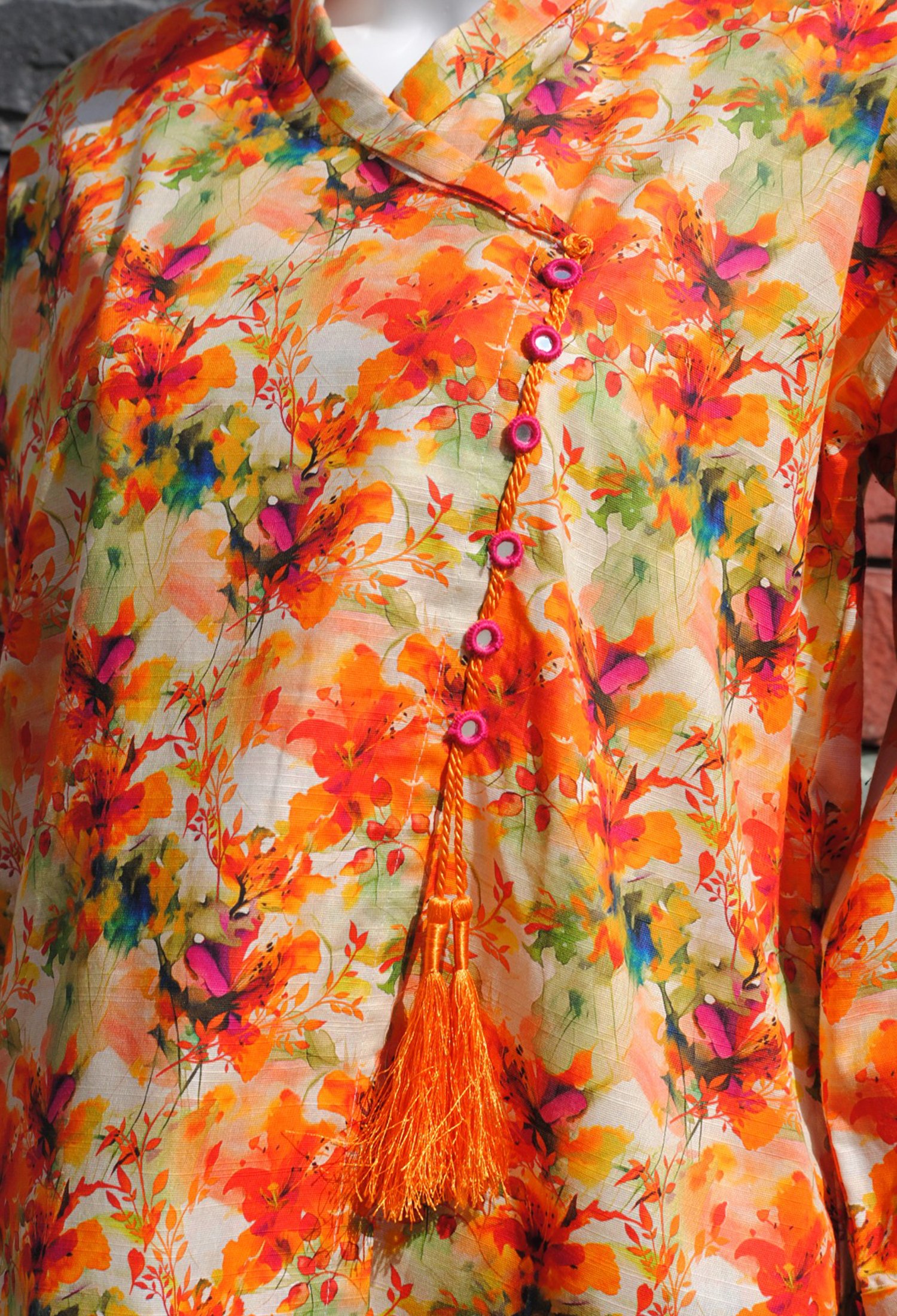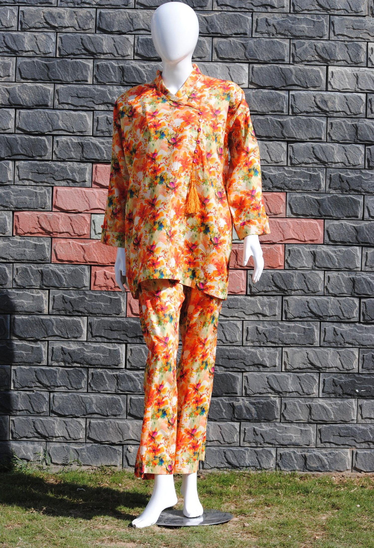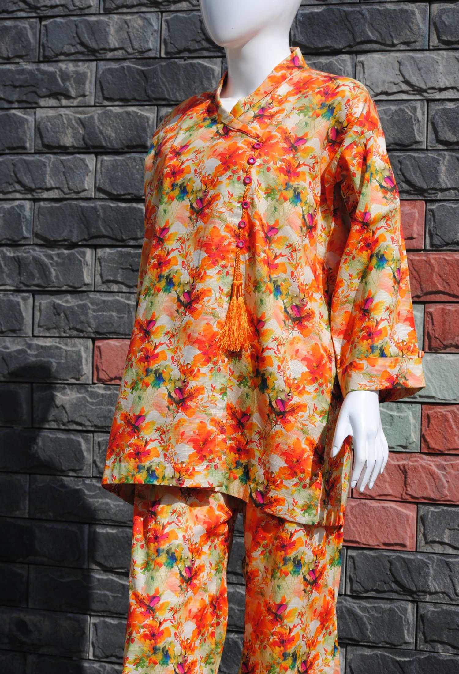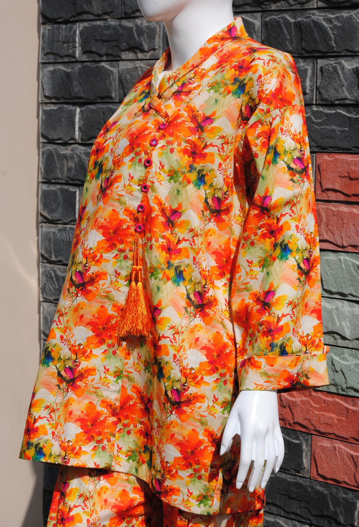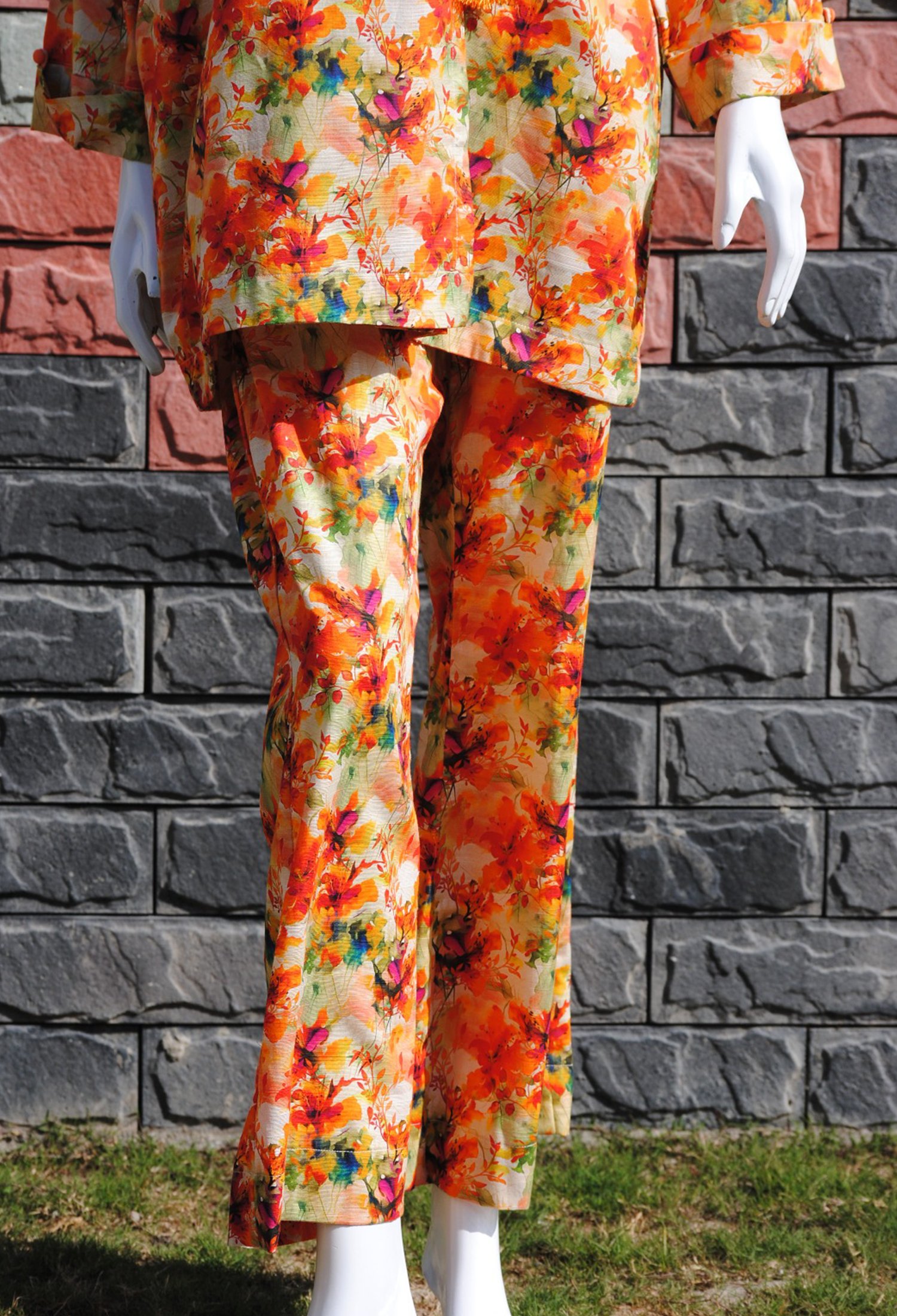 Measure around your natural waistline, keeping the tape a bit loose.| Embrace seasonal charm with this 2-piece Khaddar set, featuring bright colors in a stunning autumn leaves design. Perfect for a cozy yet stylish fall look! |