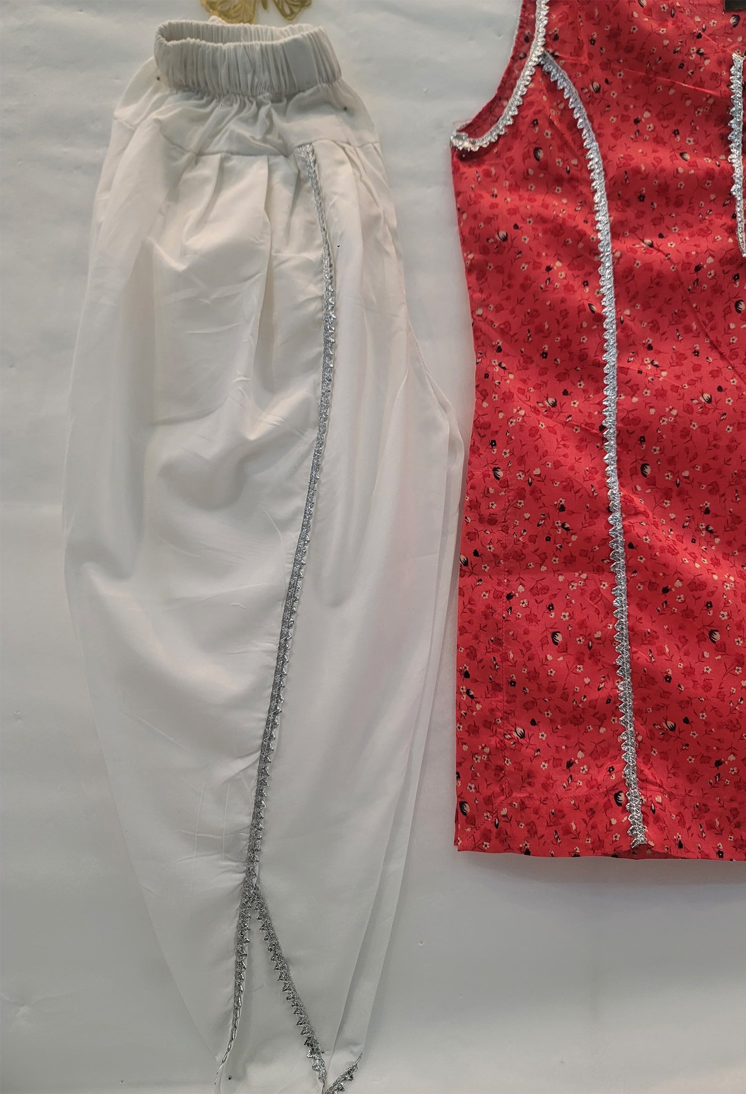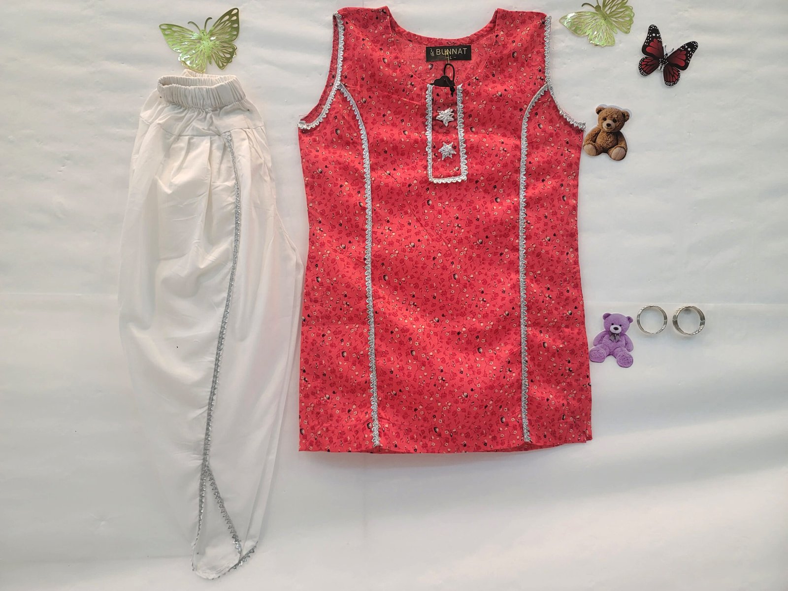 Dress your little one in our 2 piece beautiful printed pink shirt with white tulip shalwar. Round neckline with silver dori.