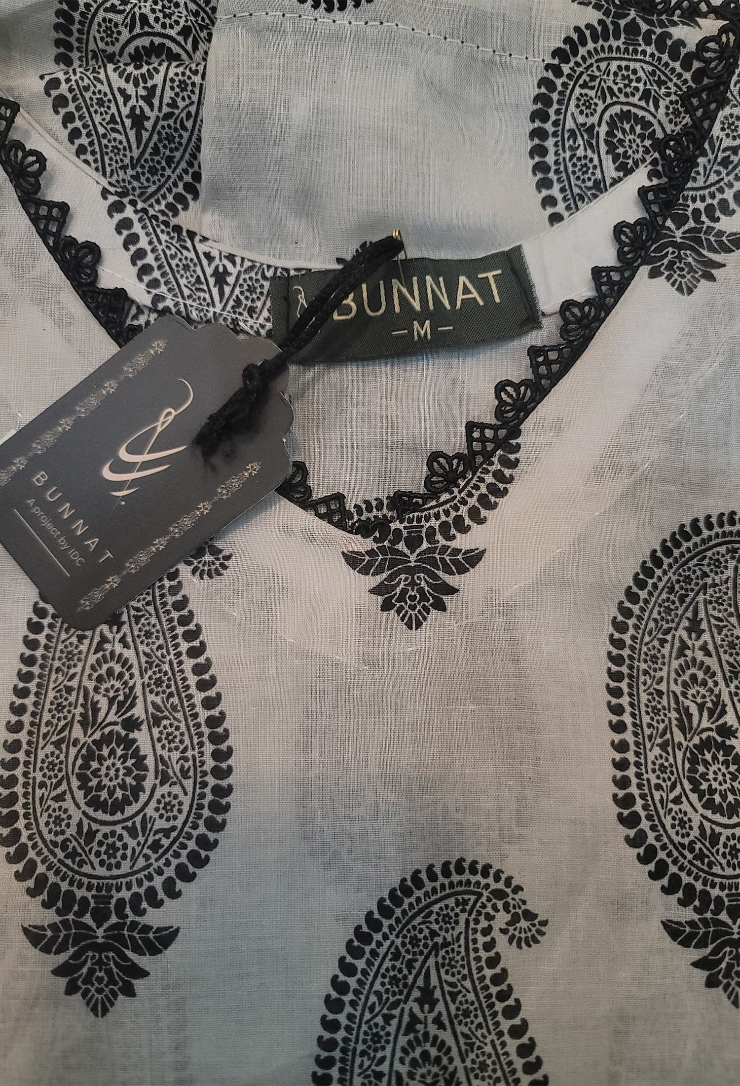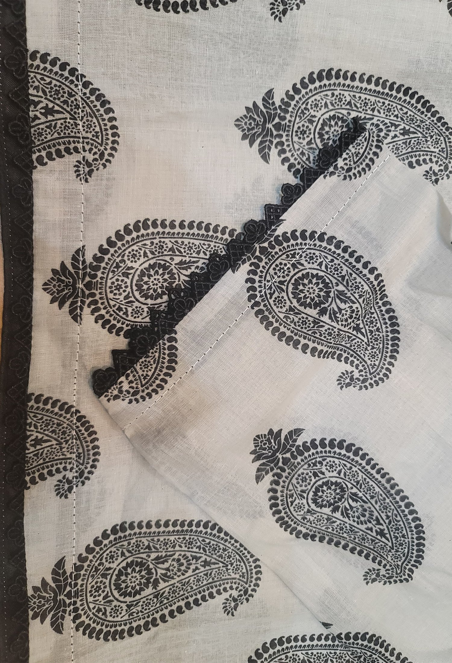 2 Pc Printed Black Motifs with White base Shirt with Shalwar, V neck design with lace, Full sleeves with Lace.