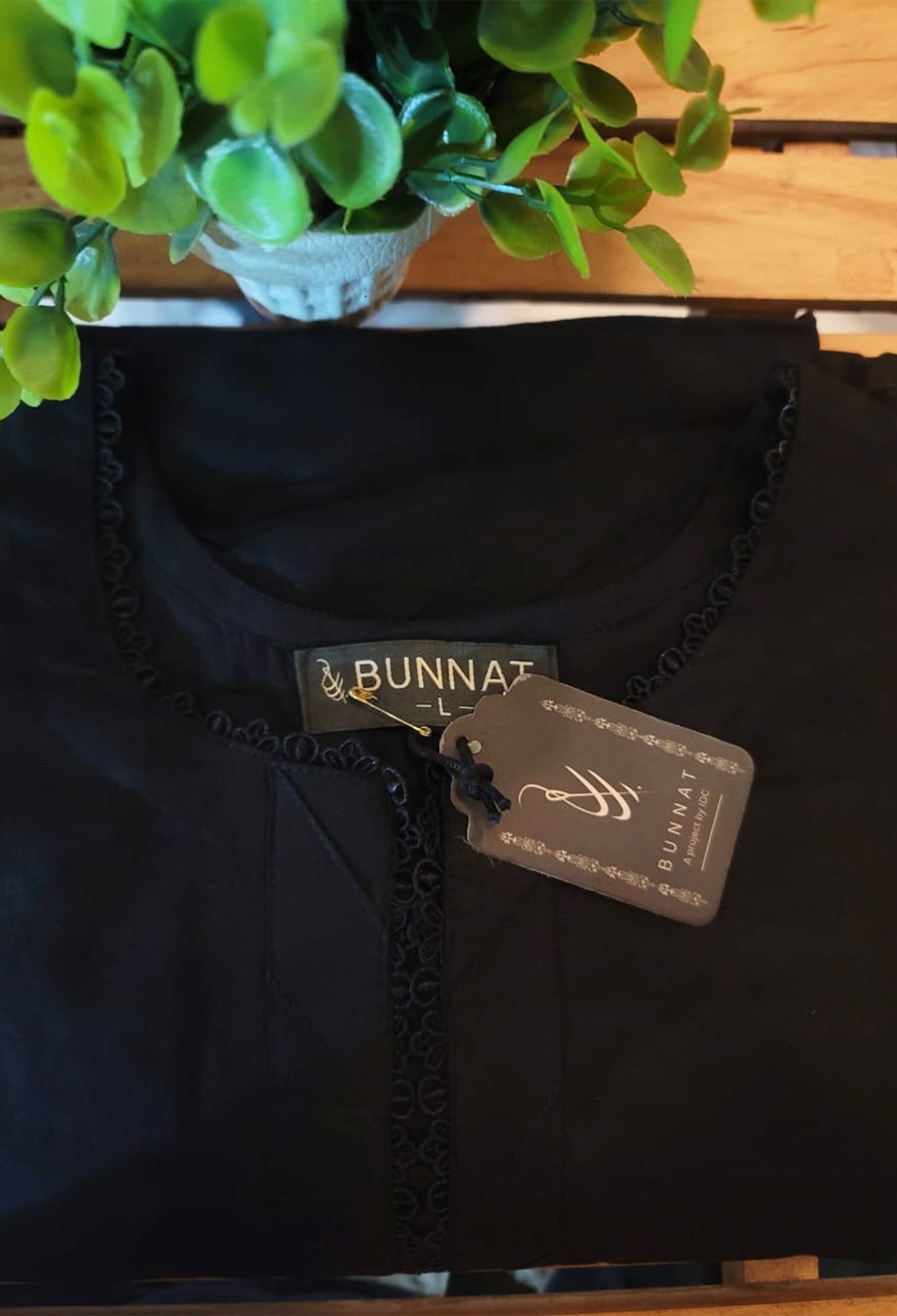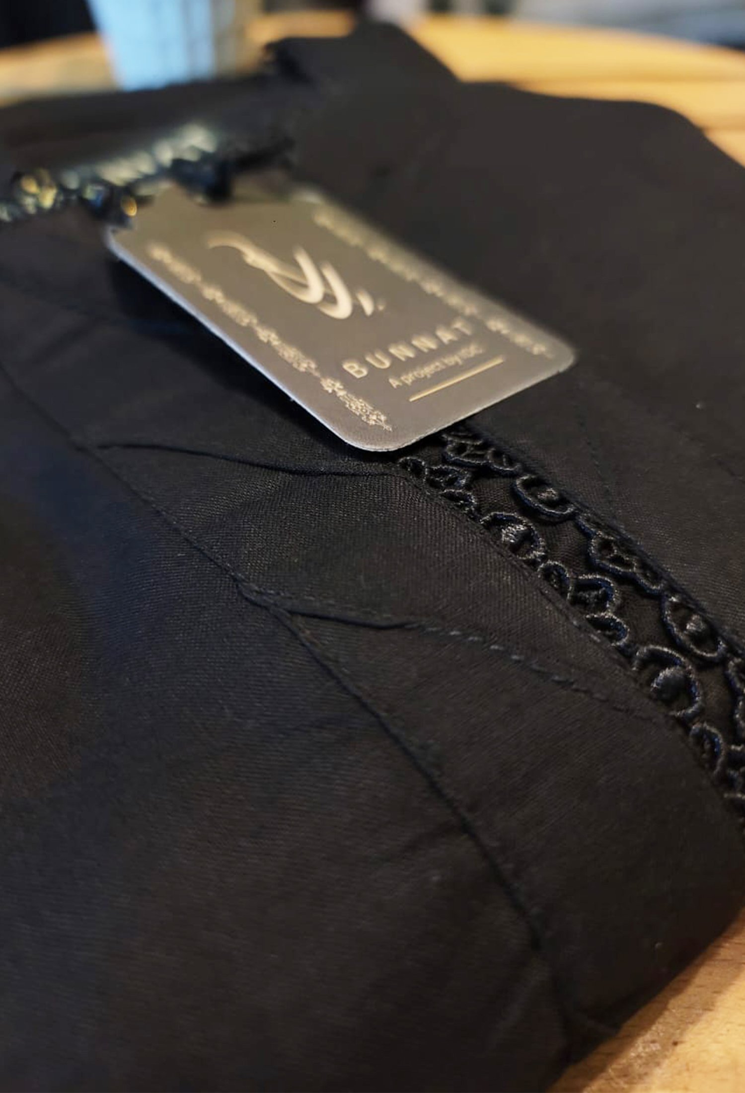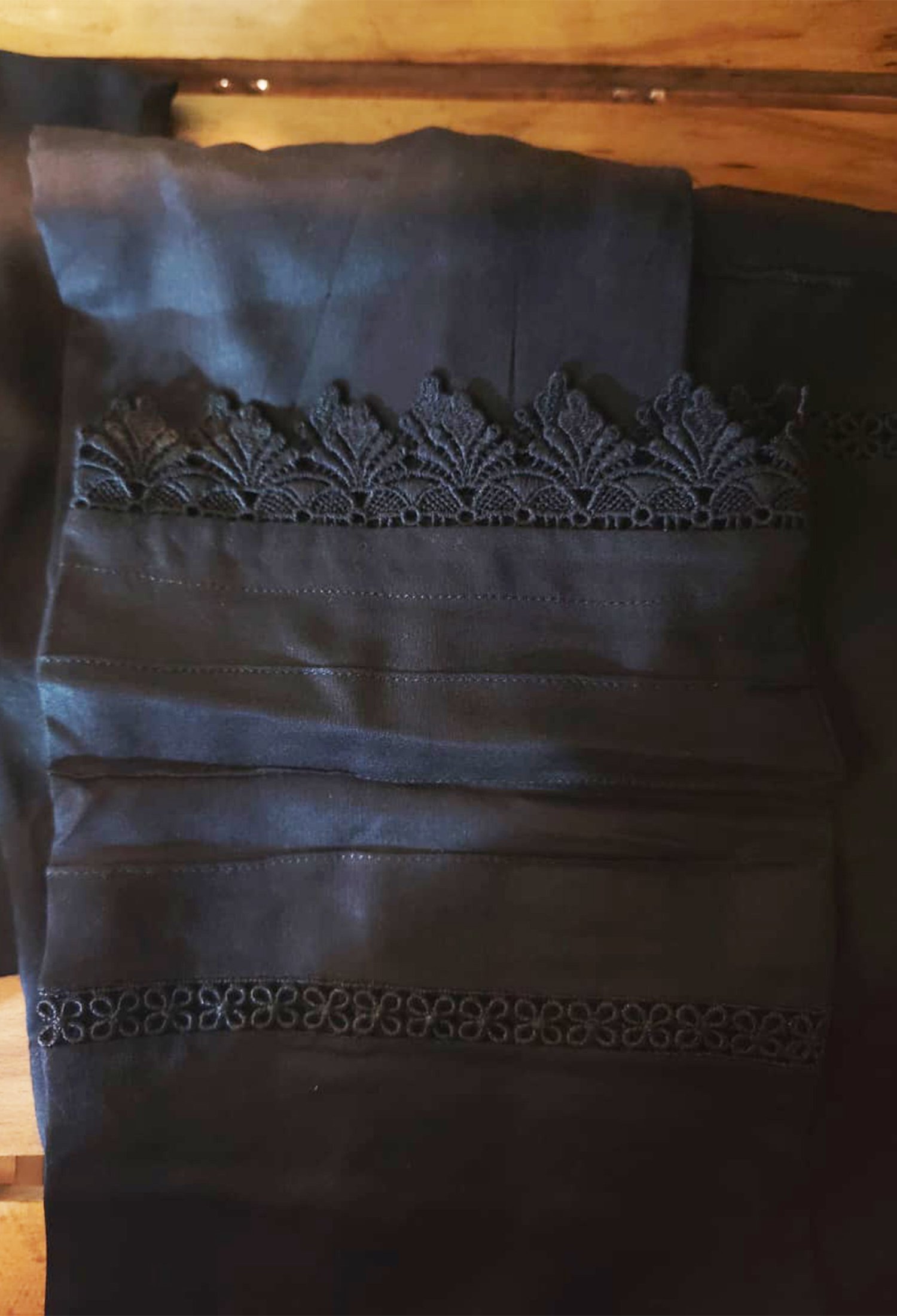 2 pc Solid Black Shirt with trouser, Round neck with Lace design, Full sleeves with double lace design.