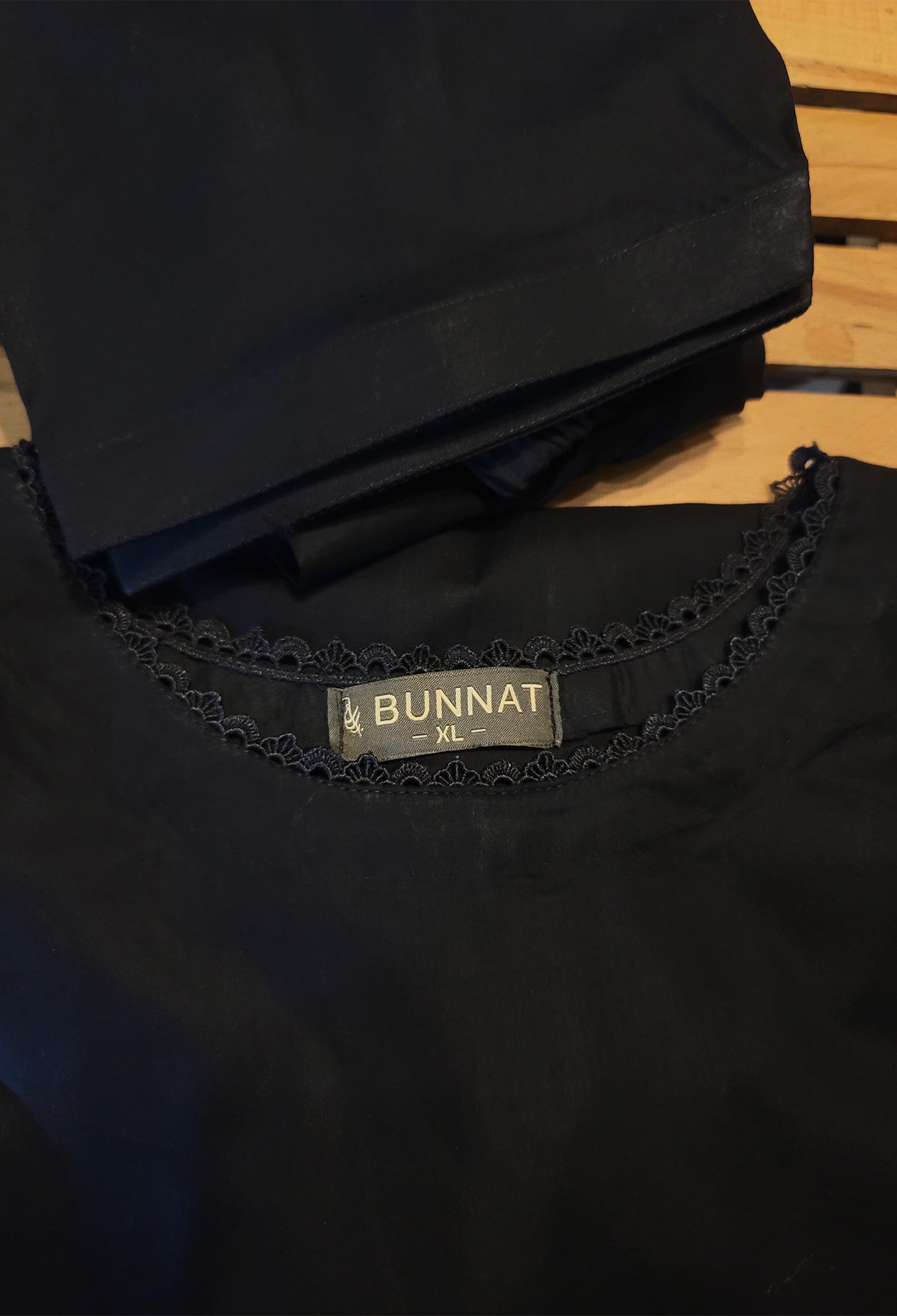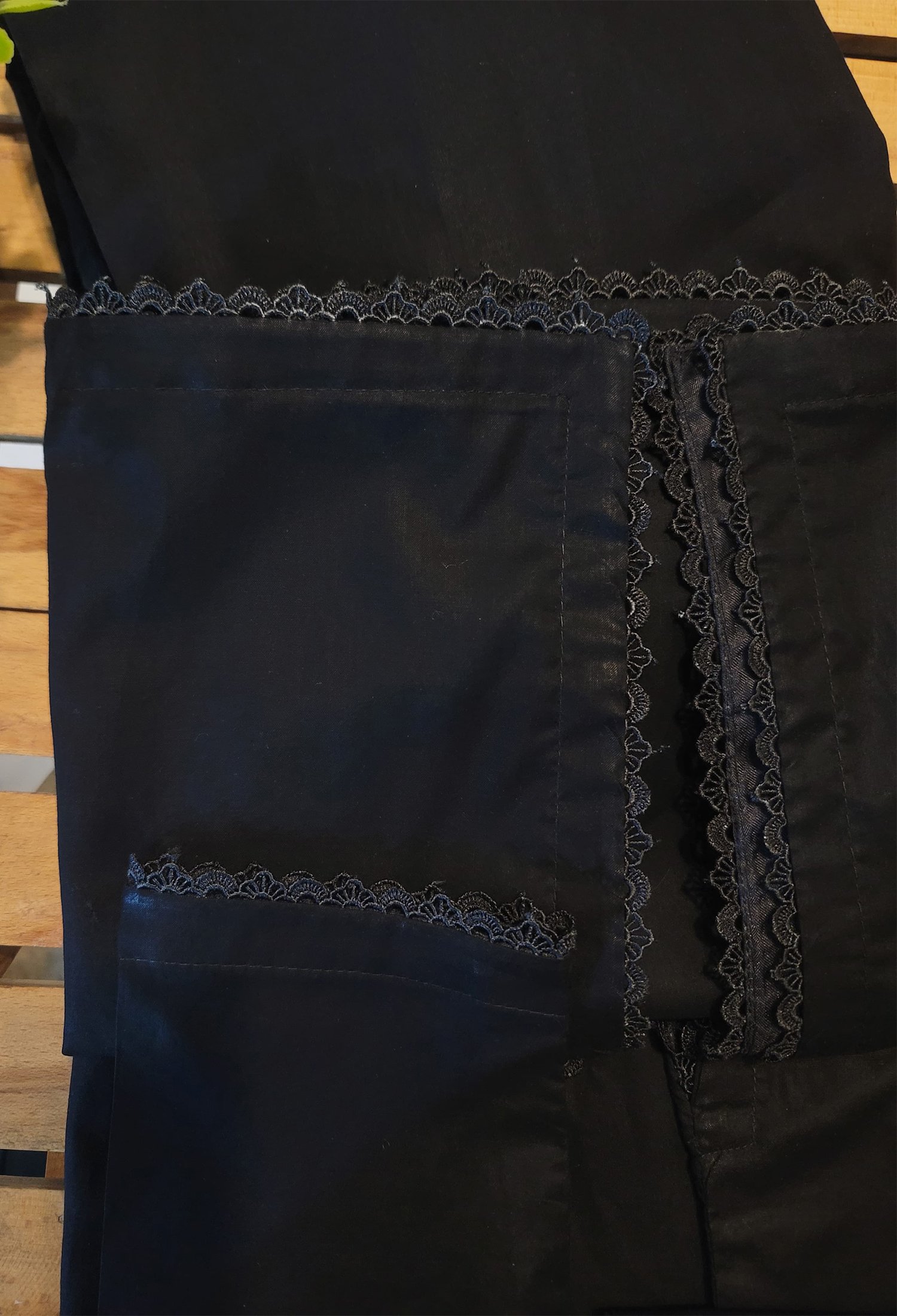2 pc Solid Black lawn shirt with shalwar, Round neck with lace, Full sleeves with lace.